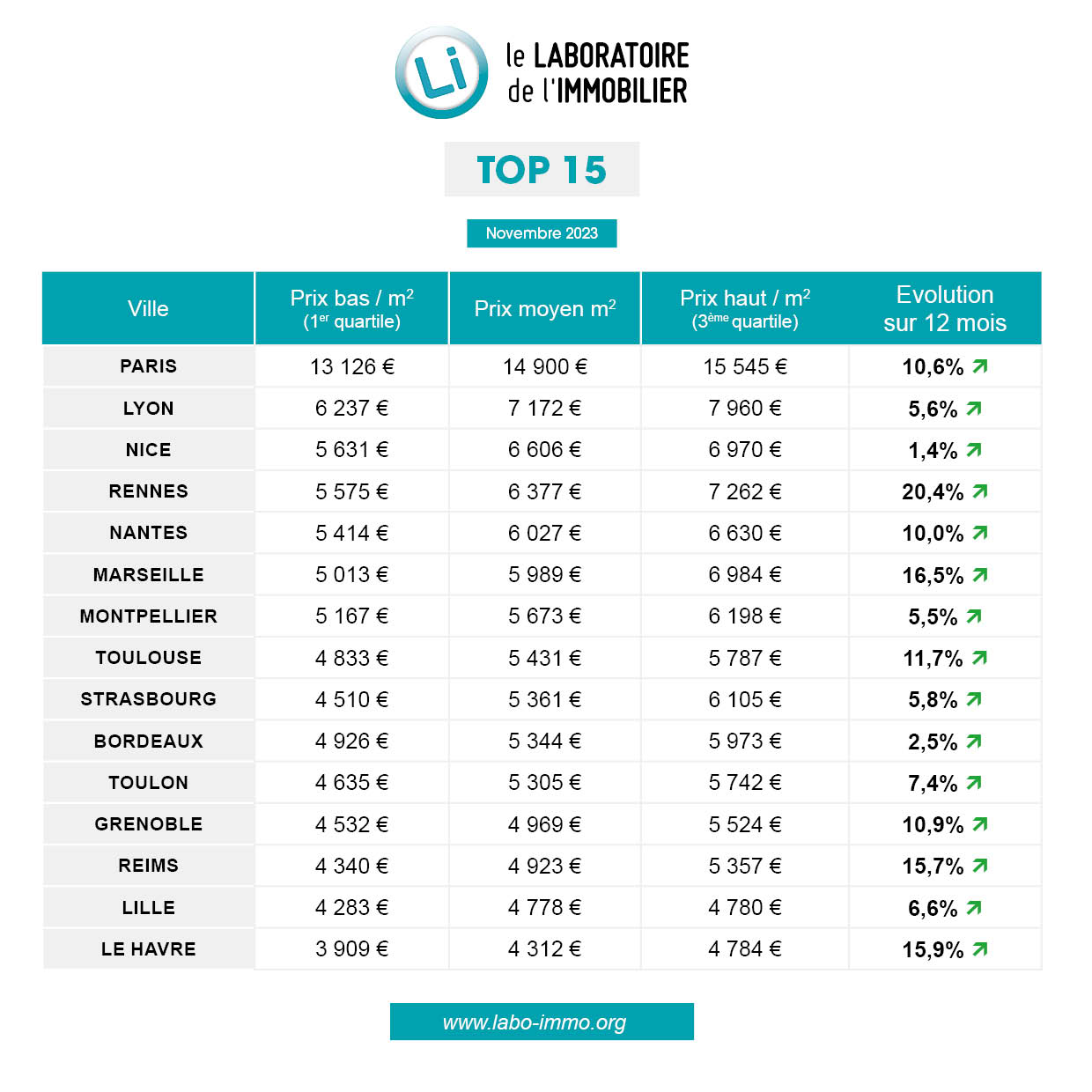 Toutes les communes du TOP15 ont vu leur prix moyen progresser ; Nice et Bordeaux affichent les hausses les plus modestes (+1,4 et 2,5 %, respectivement), tandis que les prix ont bondi de plus de 15 % à Rennes, Marseille, Le Havre et Reims. A Marseille, plusieurs projets sur le très prisé 8ème arrondissement ont contribué à cette progression.