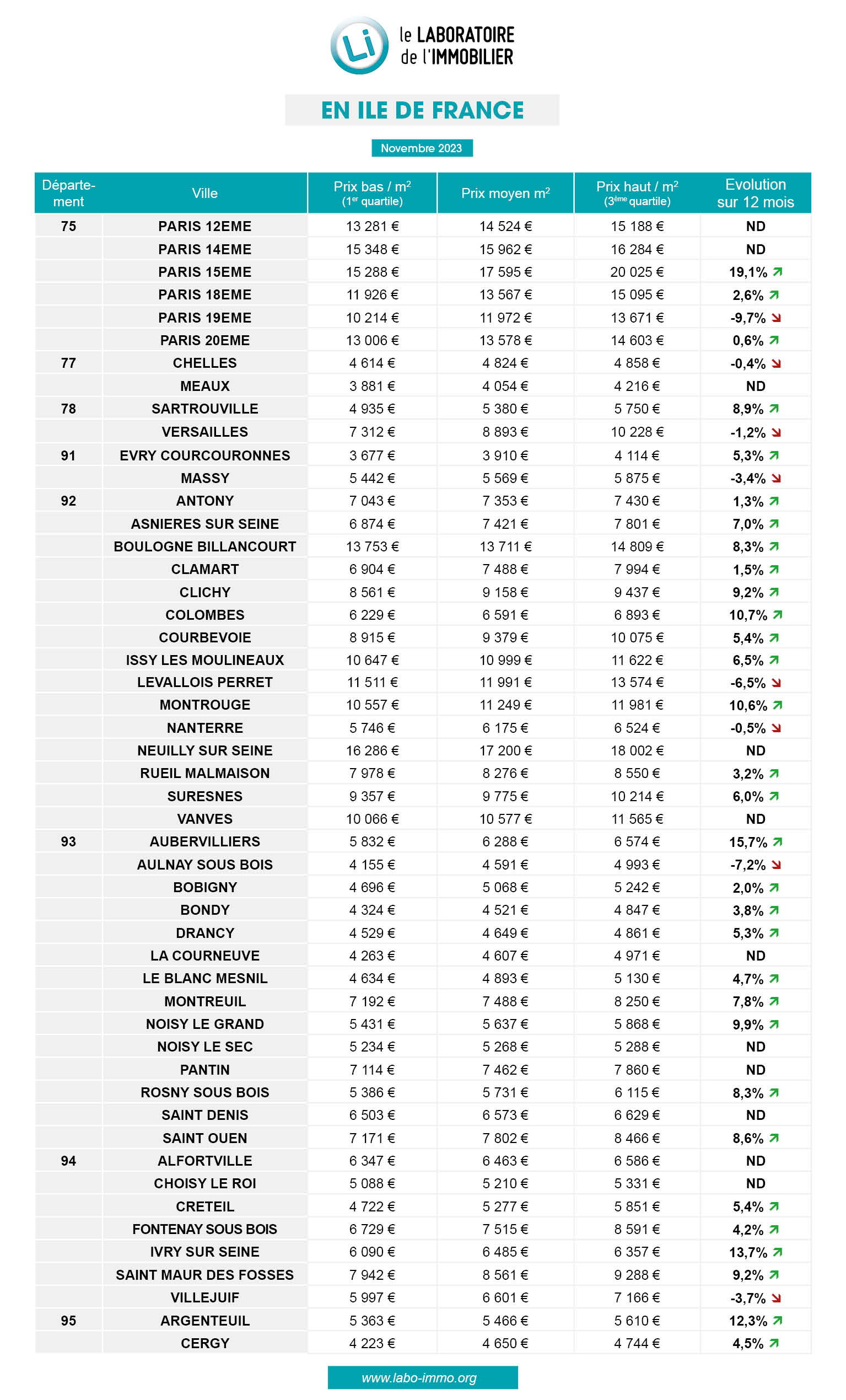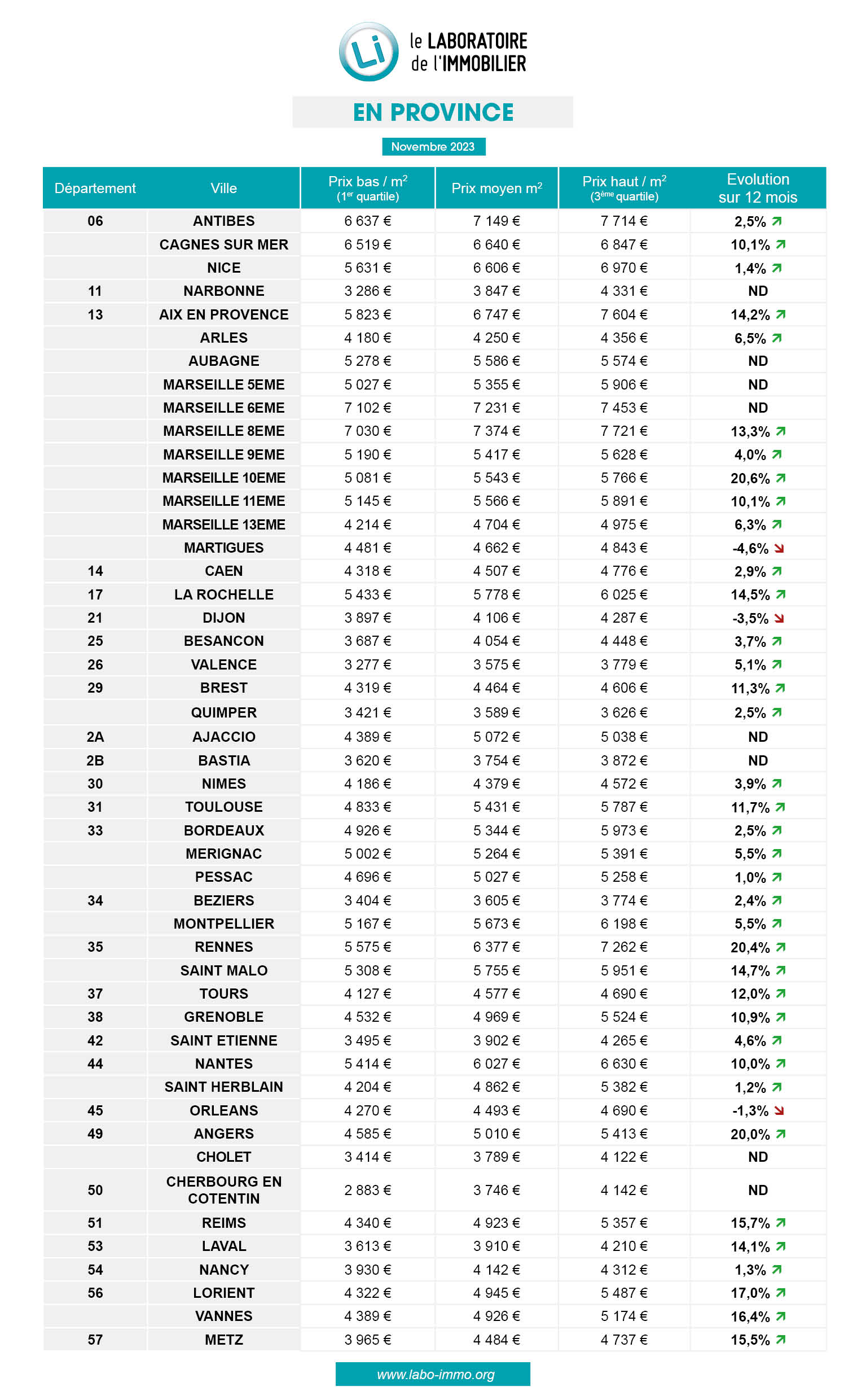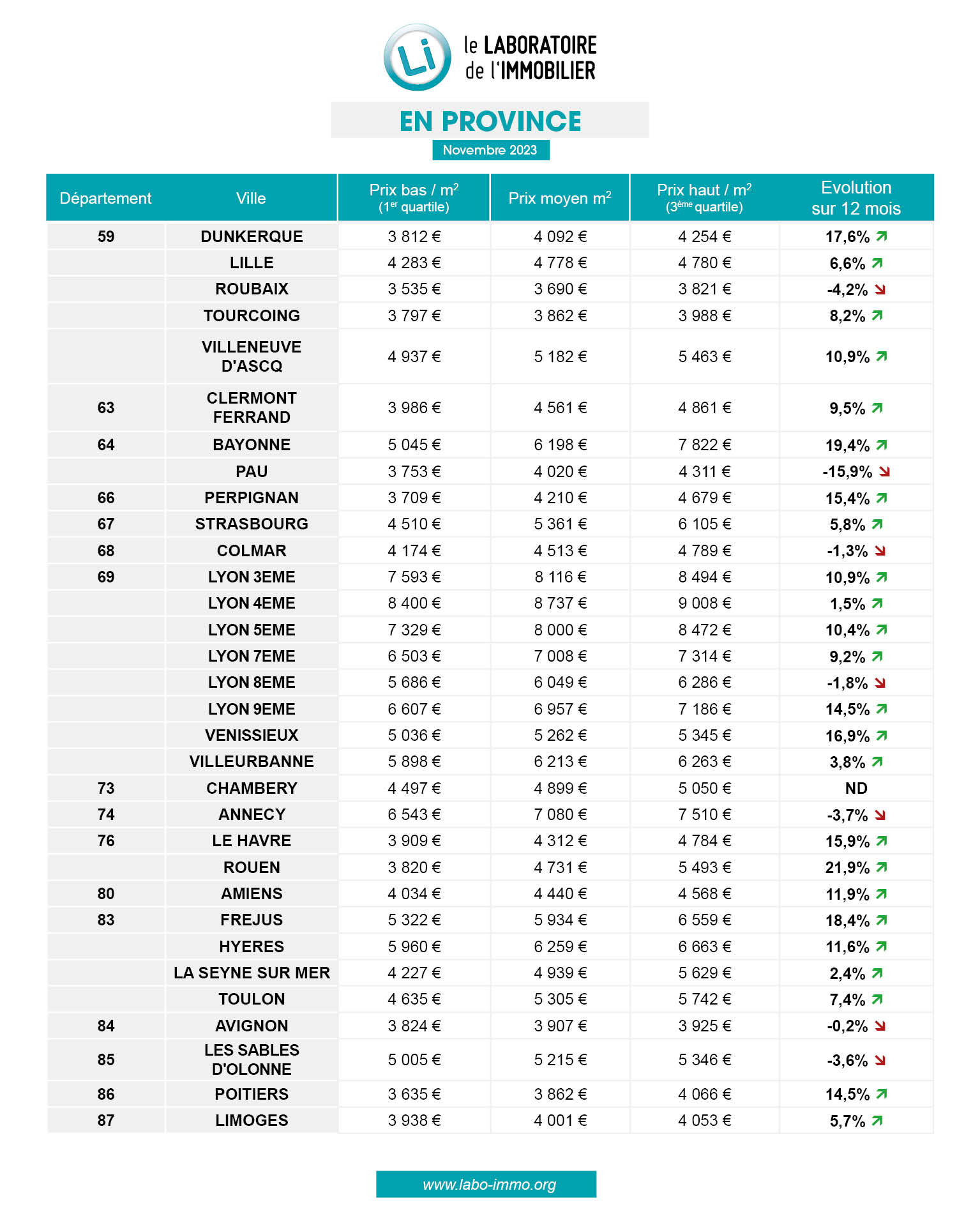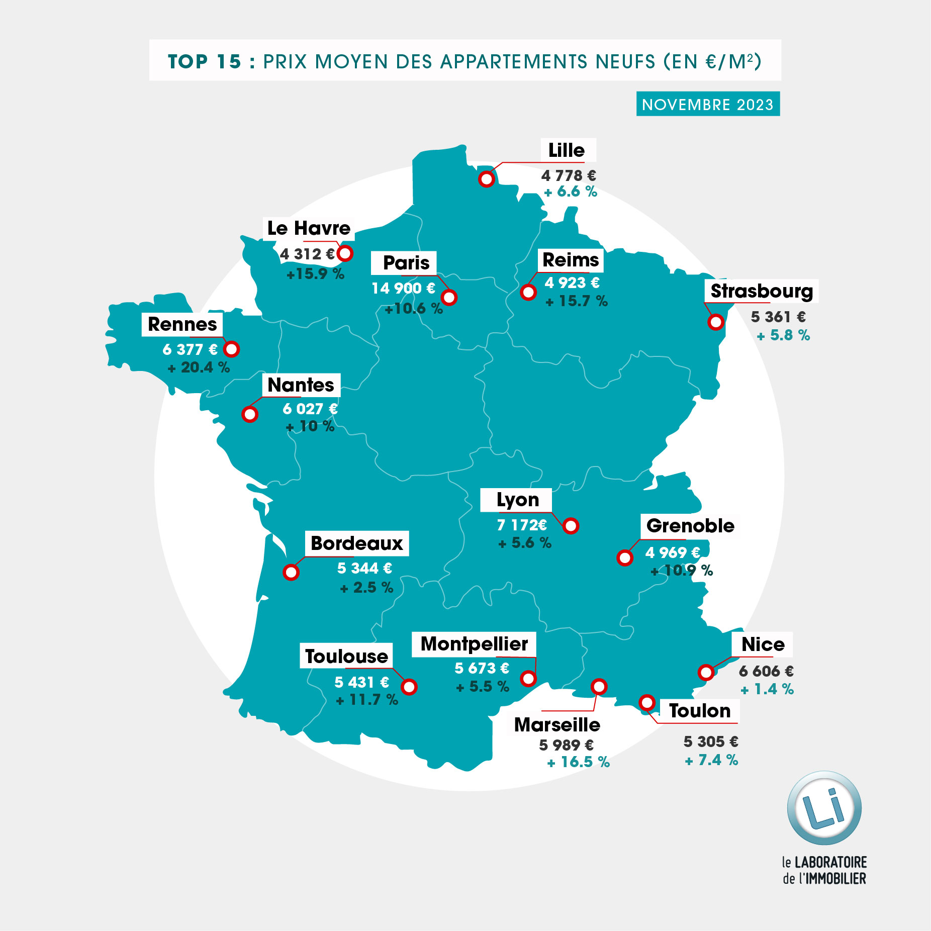 Paris le 23 novembre 2023 – Le Laboratoire de l’Immobilier publie la 9ème édition de son baromètre des prix de l’immobilier neuf sur plus de 100 villes de France métropolitaine. Son objectif est d’informer les particuliers sur les prix des logements neufs en cours de commercialisation et leurs évolutions.